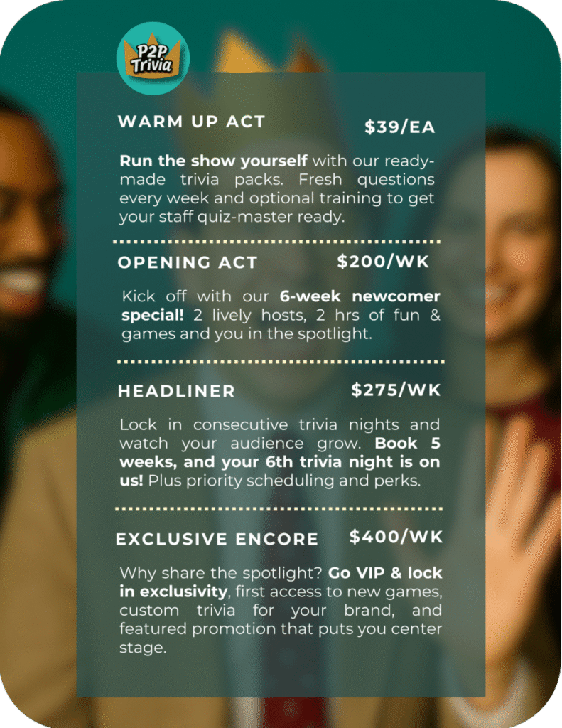 Our packages fit your budget and your vibe, whether you’re planning a one-off night of laughs or a full season of bragging rights. Every dollar goes into creating moments your crowd will still be talking about next week.